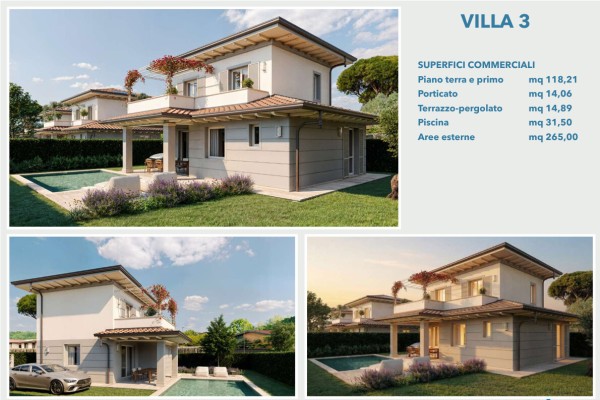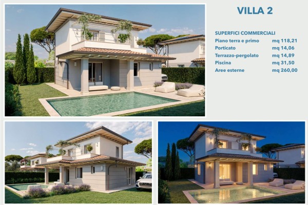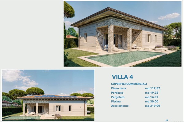 A Marina di Pietrasanta, nella località di Tonfano, a circa 950 metri dal mare in zona tranquilla e di espansione, si vendono quattro ville singole che saranno realizzate approssimativamente per la stagione estiva del 2028 delle quali inizieranno i lavori per fine anno del 2026. Tre ville sono speculari, su due livelli abitativi e composte al piano terra da ampio soggiorno con porticato, sala da pranzo, cucina abitabile, camera matrimoniale e bagno di servizio; al primo piano troviamo due camere matrimoniali, un bagno e splendida terrazza solarium pergolato. Possibilità di fare una piscina, non compresa nel prezzo richiesto, possibilità anche di personalizzare sia il progetto sia i materiali i quali sono di ottima qualità, giardino sui quattro lati con posti auto, vendita "Chiavi in mano". Andrà solo arredata!