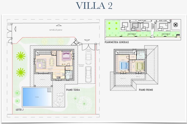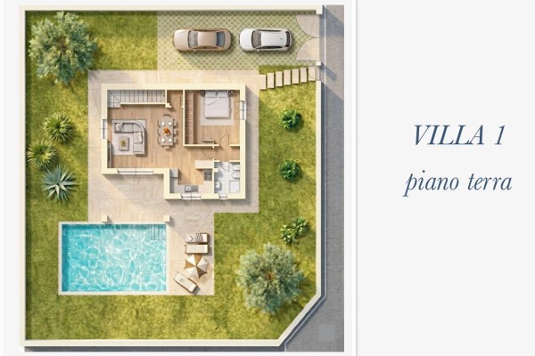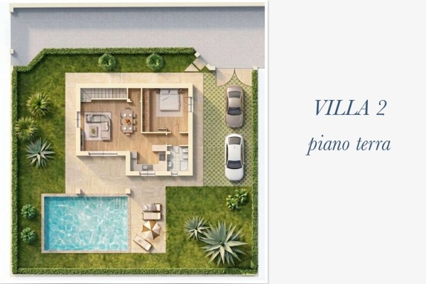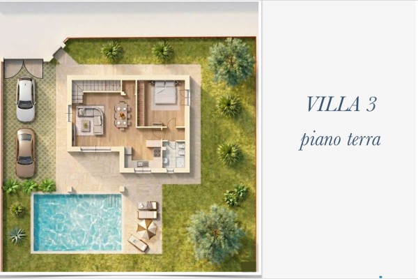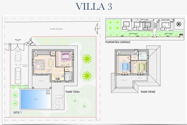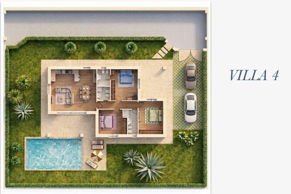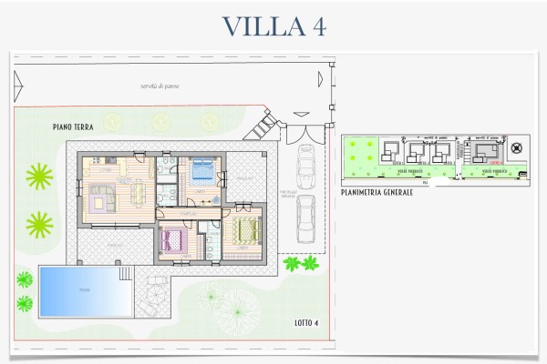 Mentre la villa n°4 se pur ha circa la stessa metratura delle altre è disposta al solo piano terra, composta da ampio soggiorno con angolo cottura a vista e porticato e pergolato, disimpegno, tre camere matrimoniali di cui una con bagno privato e altri due bagni. Anche questa con giardino sui quattro lati e posti auto.